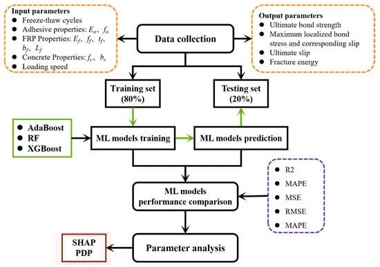 The workflow of the machine learning prediction process is illustrated in Figure 9. First, data on the bond performance of FRP-concrete interfaces were collected from experimental results and relevant literature, followed by data preprocessing. Subsequently, machine learning models were employed to predict key bond performance parameters, and hyperparameters were tuned using optimization algorithms to enhance model performance. The predictive accuracy of different models was then compared using evaluation metrics to identify the optimal model. Finally, SHapley Additive exPlanations (SHAP) analysis was used to quantify the contribution of each input variable to bond performance, and partial dependence plots (PDPs) were employed to reveal the nonlinear influence trends of critical factors.