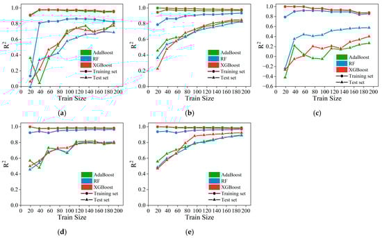 Learning curves of ML models: (a) Pu; (b) ; (c) Sf; (d) Su; (e) Gf.