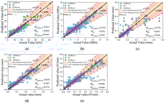 Relationship between predicted and true values of different ML models: (a) Pu; (b) ; (c) Sf; (d) Su; (e) Gf.