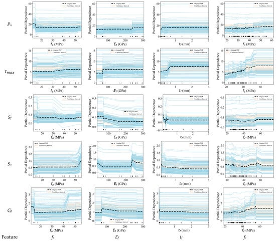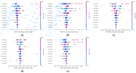 In this study, the XGBoost machine learning model was employed in conjunction with the SHAP (Shapley Additive Explanations) analysis method to investigate the influencing factors governing the bond performance at the FRP–concrete interface. The SHAP approach enables a quantitative assessment of the contribution of each input variable to the model’s predictions, thereby revealing the key factors affecting the interfacial behavior between FRP sheets and concrete. Table 5 summarizes the overall SHAP-based feature importance rankings, highlighting the varying contributions of input variables across different output parameters. Figure 13 further visualizes the distribution of local SHAP values, providing insights into the individual influence of each feature on the model predictions.