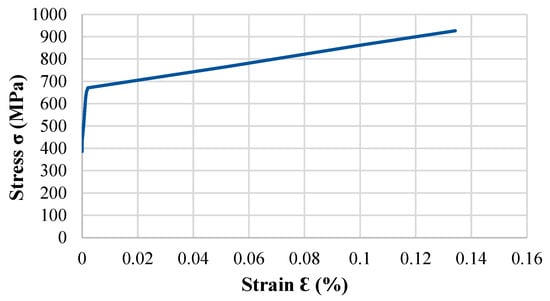 The offset method is used for prestressing (activating) the Fe-SMA. The intersecting slope of Young’s modulus (E) of Fe-SMA was offset by 2% of the strain (which is the recovery strain) []. Initially, the prestressing (the recovery stress of 387 MPa) was directly applied to the Fe-SMA, followed by the altered true stress–strain curve of the Fe-SMA shown in Figure 6 for the beams strengthened with the prestressed Fe-SMA.