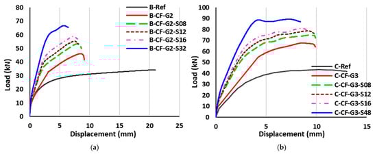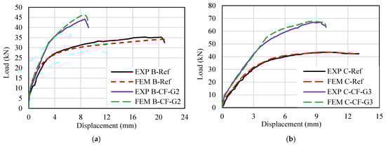 To confirm the accuracy of the FE beam models, the results in terms of load–displacement curves and crack patterns were compared with those from the experimental study []. Figure 8 shows the load–displacement curves of the reference and EBROG strengthened beams from the experimental and FE analyses. As shown in this figure, the overall trend of the curves at the yield and ultimate stages from the FE analysis closely matches the experimental curves. The ultimate load of the reference beam in Group B from the experiment and numerical analysis was 35.18 kN and 34.19 kN, respectively, indicating a 2.8% difference. The ultimate load of the EBROG strengthened beam (B-CF-G2) from the FE analysis and experiment was 46.15 kN and 44.14 kN, respectively, showing about a 4.5% difference. Furthermore, the ultimate load of the reference beam in Group C from numerical and experimental analyses was 45.74 kN and 44.50 kN, respectively (about a 2.7% difference). The ultimate load of the EBROG strengthened beam (C-CF-G2) from the numerical and experimental analyses was 67.2 kN and 66.95 kN, respectively (about a 1% difference).