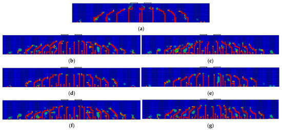Crack patterns (tensile damage) of the select RC beams at the failure stage. (a) C-Ref. (b) C-CF-G3-S12. (c) C-SMA-G3-S12. (d) C-CF-G3-PS12. (e) C-SMA-G3-PS12. (f) C-PCF-G3-S12. (g) C-PSMA-G3-S12.