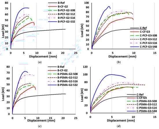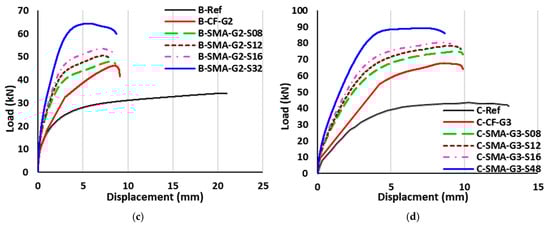 Load-deflection curves of beams strengthened with NSM prestressed Fe-SMA strips and EBR non-prestressed CFRP or Fe-SMA sheet. (a) Group B5. (b) Group C5. (c) Group B6. (d) Group C6.
