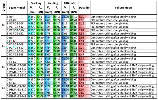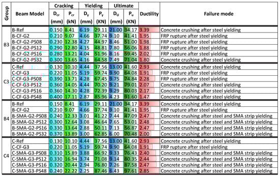 Figure 15 summarizes the key parameters for beams strengthened with NSM non-prestressed Fe-SMA strips and EBR prestressed CFRP or Fe-SMA sheet. Prestressing the EBR CFRP sheet or Fe-SMA sheet improved the cracking load of hybrid-strengthened beams, ranging from 30% to 119%, as well as the cracking displacement from 47% to 208%. In general, the cracking load and displacement of beams were enhanced when the EBR CFRP or Fe-SMA sheet was prestressed. Further, the prestressing of the EBR sheet (either CFRP sheet or Fe-SMA sheet) had an insignificant effect on cracking load and displacement compared to that of a similar beam with NSM prestressed Fe-SMA strips. Similar to other hybrid-strengthening configurations, the yield load of the beams significantly increased (ranging from 42% to 127%), while the yield displacement decreased (ranging from 1% to 55%). In Groups B5 and B6, the maximum yield load of 61 kN was observed for B-PCF-G2-S32 and B-PSMA-G2-S32 beams. In Groups C5 and C6, the maximum yield load was 82 kN and 85 kN for C-PCF-G3-S48 and C-PSMA-G3-S48 beams, respectively. Prestressing the EBR CFRP sheet or Fe-SMA sheet had a small impact on the yield load and displacement response of beams compared with the similar beams with the NSM prestressing Fe-SMA strips.