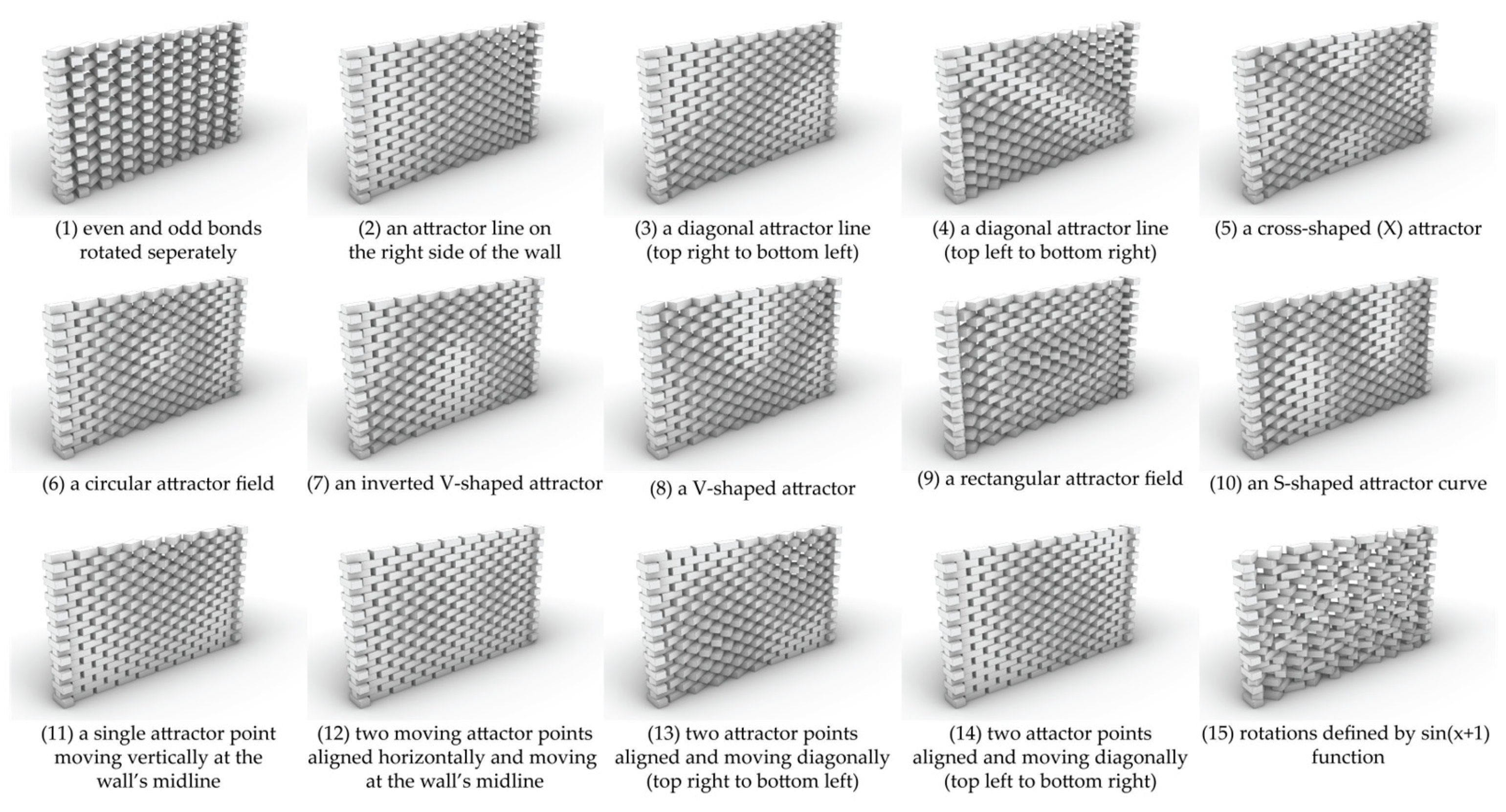 | Brick Rotation Angles | Governs the pattern of each wall | Variable (0–90 degrees) | Varied in 2° increments (46 levels) for brute-force sampling; random sampling generated continuous values between 0–90° | |