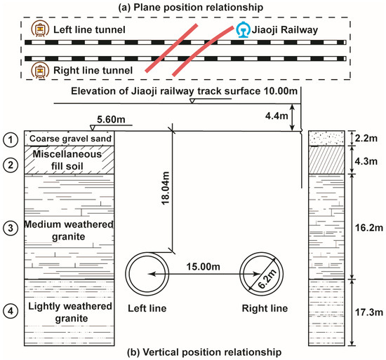 The section between International Cruise Port Station and Taishan Road Station on the west extension of Qingdao Metro Line 2 is located in Shinan District, Qingdao, China. It adopts a configuration of two single-track, single-bore shield tunnels arranged side by side, with the left tunnel measuring 499.053 m and the right tunnel 489.890 m in length. The horizontal center-to-center spacing between the tunnels is approximately 15 m. The tunnels intersect the existing railway at an angle of 40°, with a burial depth of approximately 18 m and a tunnel radius of 3.1 m. As shown in the engineering geological profile in Figure 1, the tunnel passes through, from top to bottom, railway subgrade, miscellaneous fill, coarse gravel sand, moderately weathered granite, and slightly weathered granite. The main tunnel structure is located within the moderately and slightly weathered granite layers. In addition, a fractured zone approximately 36 m in length and inclined at about 70° is present beneath the railway. Detailed geotechnical parameters of the soil and rock layers are provided in Table 1. The study section is located along the Jiaozhou–Jinan Railway, a national Class I line. The track is a ballasted track with 60 kg/m rails, a crushed stone ballast bed, and reinforced concrete sleepers. The subgrade height is approximately 4.40 m. The shield tunnel passes beneath the main line of the Jiaozhou–Jinan Railway, where the permitted train speed is 60 km/h. The maximum single-axle load of the train is 17 tonne. In this study, drawing on the complex geological conditions of the project, the rail settlement and deformation characteristics induced by twin shield tunneling beneath the existing railway were investigated, with particular emphasis on the excavation of the right-line tunnel and the cumulative effects of twin-line tunneling. The designed operating speed of the railway underpass section lies within an urban area where construction safety risks are high and any incident could have serious consequences. In accordance with the Code for Design of High-Speed Railways [23], and the Technical Code for Monitoring of Urban Rail Transit Engineering [24], and with reference to domestic metro projects that have successfully crossed existing railways as well as expert opinions from the project team, the control criteria adopted for the segment crossing the railway subgrade are as follows: the railhead settlement must not exceed 4 mm and the subgrade settlement or heave must not exceed 10 mm. According to the Technical Code for Structural Safety Protection of Urban Rail Transit Engineering [25], during shield tunnel construction, the vertical displacement of the vault, the horizontal displacement of the haunch, and the vertical displacement at the construction site shall all remain below the warning threshold of 10 mm and the control limit of 20 mm.