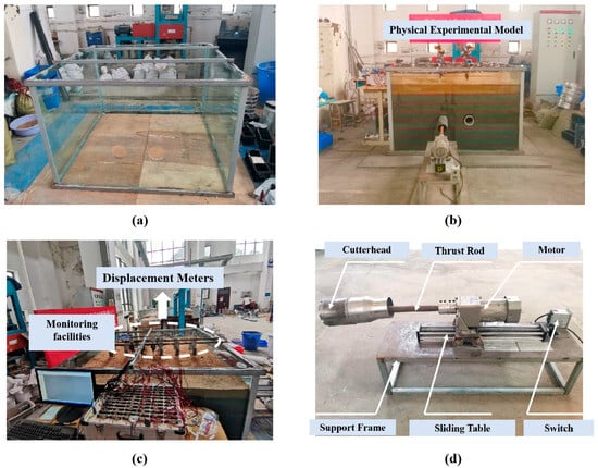 Tunnel excavation and simulation equipment: (a) Actual view of the physical model test chamber; (b) Schematic diagram of tunnel excavation; (c) Model layout diagram; (d) Shield tunneling simulation device.