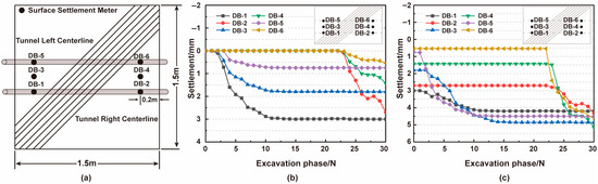 To investigate the surface settlement pattern induced by shield tunneling, six monitoring points (DB-1 to DB-6) were arranged along the tunnel axis in the laboratory model, as shown in Figure 3a. Surface settlement data were recorded at 5 cm excavation intervals.