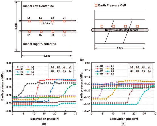 Earth pressure cell layout and soil pressure variations during shield tunneling: (a) ayout of earth-pressure cells in the model box; (b) Soil pressure variation after completion of right-line tunneling; (c) Soil pressure variation after completion of left-line tunneling.