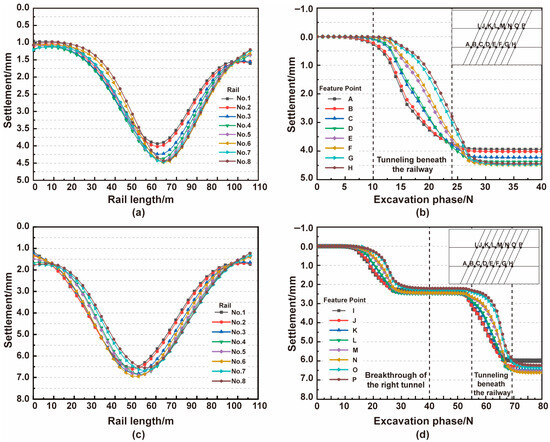 Railhead settlement curves and characteristic point responses during right-line and left-line tunneling: (a) Railhead settlement curve during right-line tunneling; (b) Railhead settlement curves of rail monitoring points during right-line tunneling; (c) Railhead settlement curve during left-line tunneling; (d) Railhead settlement curves of rail monitoring points during left-line tunneling. (A–P) denote the monitoring points along the right and left tunnel axes, respectively.