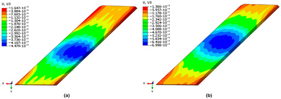 As shown in Figure 7, the settlement contour maps of the railway subgrade were presented for both the right-line and left-line tunneling completions. After the right-line tunneling, the subgrade deformation was predominantly vertical settlement, with a maximum settlement of 4.48 mm, located directly above the crown of the right tunnel. Following the completion of the left-line tunneling, settlement remained the dominant deformation mode, with the maximum displacement increasing to 7.00 mm. The settlement center shifted to the area directly above the central axis between the two tunnels, and the overall deformation intensified. Although the magnitude of settlement satisfies the requirements specified in the applicable construction design codes, the cumulative disturbance from twin tunnels’ excavation still poses a significant impact on the subgrade structure, indicating the necessity for enhanced dynamic monitoring and protective measures.