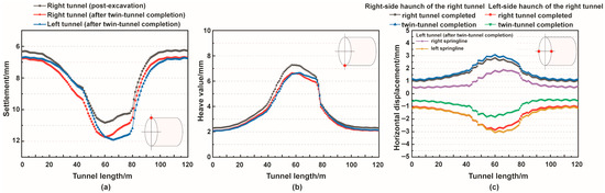 Displacement variations of tunnel monitoring points: (a) Settlement curve of the tunnel crown; (b) Heave curve of the tunnel invert; (c) Horizontal displacement curve of the tunnel haunch.