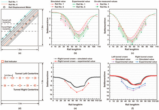 As shown in Figure 9a, displacement meters were installed at Rail 1 and Rail 6. By analyzing the monitoring data obtained after the completion of the right-line and left-line tunneling, the railhead settlement curves were compared with the numerical simulation results (Figure 9b,c). To ensure comparability with the numerical simulation results, the physical model test data were converted based on similarity theory.