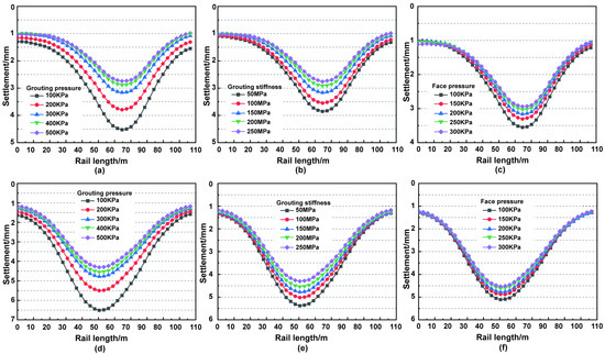 Variation in railhead settlement under different construction parameters: (a,d) Railhead settlement curves under different grouting pressures during right-line and left-line tunneling; (b,e) Railhead settlement curves under different grout stiffness during right-line and left-line tunneling; (c,f) Railhead settlement curves under different earth chamber pressures during right-line and left-line tunneling.