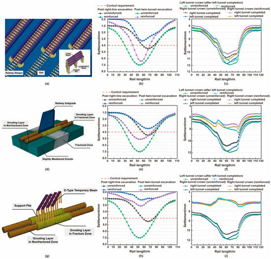 Finite element models of different reinforcement schemes and comparison of reinforcement displacements: (a) Finite element model of D-type beam reinforcement; (b) D-type beam reinforcement railhead displacement; (c) D-type beam reinforcement crown displacement; (d) Numerical model of the combined reinforcement scheme; (e) Combined reinforcement railhead settlement displacement comparison; (f) Combined reinforcement tunnel crown settlement displacement comparison; (g) Numerical model of the combined reinforcement scheme; (h) Combined reinforcement railhead settlement displacement comparison; (i) Combined reinforcement tunnel crown settlement displacement comparison.