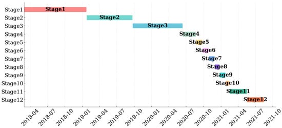 Construction of the foundation pit began in March 2018. The construction sequence was as follows: first, the retaining system was completed, including the construction of the diaphragm walls, isolation piles, jet-grouted piles and micro-piles; then, grouting was carried out, including the curtain wall beneath the diaphragm walls and the grouting curtain within the fractured zone at the pit bottom; then, the foundation piles were constructed; finally, the pit was excavated to its bottom. After excavating to the pit bottom, construction of the foundation pit was suspended until 30 June 2023. During the construction process, if monitoring detected anomalies such as a sudden increase in deformation, unexpected settlement spikes, tunnel rebound events, etc., the construction team would immediately activate a real-time dynamic adjustment mechanism. This involved a dual approach: On one hand, based on monitoring data including strut axial forces and pit displacements, the axial forces of the servo steel struts were adjusted in real-time through methods like incremental loading or stepwise unloading. If deformation exceeded warning thresholds, emergency reinforcement of strut connections or the installation of additional temporary supports was implemented. On the other hand, the ongoing excavation activity was temporarily halted. The excavation zone was re-segmented by adopting a strategy of smaller segments, shorter advance lengths, and rapid support installation while also optimizing soil removal routes and material storage locations. Concurrently, the monitoring frequency was dynamically adjusted based on the deformation rate. If monitored values approached pre-set warning thresholds, graded response protocols were immediately triggered to ensure the safety of the foundation pit and the surrounding environment. Specific working conditions and the construction schedule are detailed in Table 2 and Figure 6.
