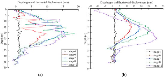 Horizontal displacement of the diaphragm walls: (a) Profiles S3; (b) Profiles S10.