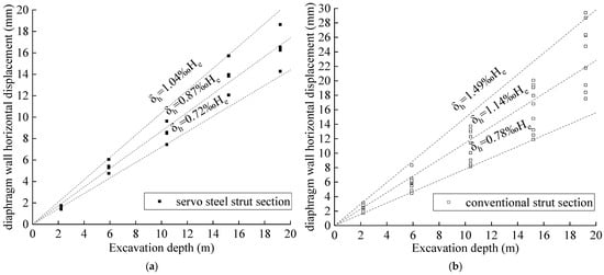 Horizontal displacement of the diaphragm walls: (a) servo steel strut section; (b) conventional strut section.