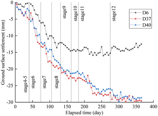 Monitoring of ground surface settlement during the retaining system construction phase ended in May 2019. Settlement monitoring resumed during the excavation phase, commencing in August 2020. Consequently, deformation measured during the excavation phase does not include that induced by pre-excavation activities such as retaining system construction and foundation pile installation. Figure 10 illustrates the variation in ground surface settlement during the excavation period, where negative values indicate settlement. Analysis focused on monitoring points: D6 (midpoint, north side), D37 (midpoint, south side), and D40 (midpoint, west side). It can be seen from the figure that the settlement rate of the north-side monitoring point D6 increased significantly during Stages 6 to 9, while the increment of deformation slowed down after Stage 9 when the excavation depth exceeded 20 m. In contrast, the settlement of the south-side D37 and west-side D40 continued to accumulate throughout the entire excavation process. This indicates that servo steel struts significantly reduce the depth sensitivity of surface settlement during the ultra-deep foundation pit stage, where the excavation depth exceeds 20 m.