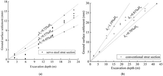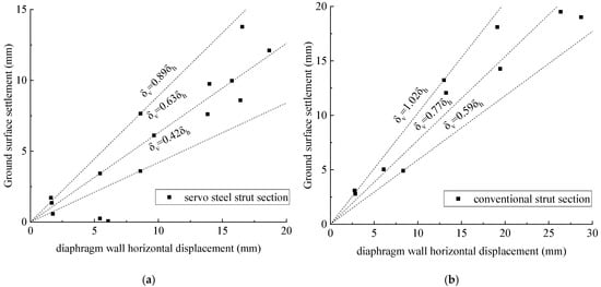 Relationship between horizontal displacement of diaphragm walls and ground surface settlement: (a) servo steel strut section; (b) conventional strut section.