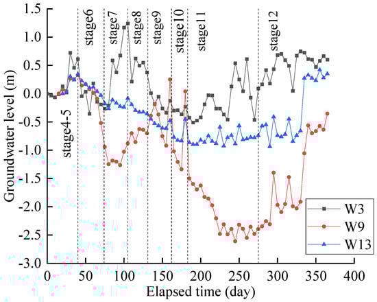 Remarkably, despite achieving the deepest excavation depth for similar pits in Shenzhen (42.35 m), this project maintained low ground settlement levels. This indicates highly effective control of settlement around the pit, primarily attributable to the synergistic effects of the following measures. The bottom-sealed diaphragm walls (embedded 4 m into the slightly weathered, low-permeability stratum) combined with high-pressure jet grouting curtains formed a fully enclosed water cutoff system, effectively severing the hydraulic connection between the excavation interior and exterior. As can be seen from Figure 12, the monitoring point with the largest groundwater level rise is W3, with a maximum rise of 1.52 m; the monitoring point with the largest groundwater level drop is W9, with a maximum drop of 2.72 m. During the entire excavation process, the groundwater level changed little, all within the project requirement that the groundwater level variation should not exceed 3 m. Therefore, the water-stop measures adopted in the foundation pit have reduced surface settlement. Isolation piles installed outside the retaining structure significantly reduced soil disturbance during excavation through their barrier effect. By pre-lowering the groundwater level within the pit, the compactness and shear strength of the base soil were enhanced, thereby reducing rebound deformation of the foundation soil and lateral displacement-induced settlement during the excavation stage.