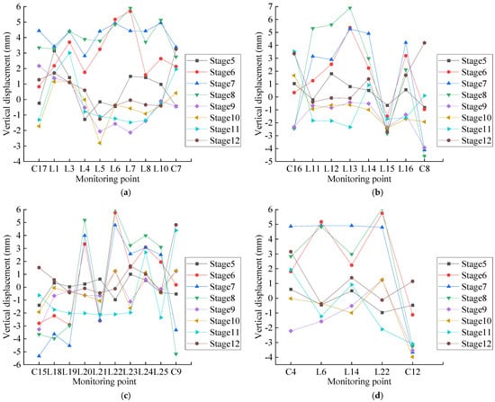 Figure 14 illustrates the evolution of vertical displacement for columns and diaphragm walls along four monitoring sections during pit excavation: Section A (points C17, L1, L3, L4, L5, L6, L7, L8, L10, C7), Section B (points C16, L11, L12, L13, L14, L15, L16, C8), Section C (points C15, L18, L19, L20, L21, L22, L23, L24, L25, C9), and Section D (points C4, L6, L14, L22, C12). Analysis of the deformation of columns and diaphragm walls during the excavation stage reveals that in Stages 4–8, where the excavation depth is less than 20 m, the columns and diaphragm walls in all sections exhibit significant heaving deformation. This resulted from soil unloading within the pit due to excavation, triggering a base rebound effect. The upward soil movement was transmitted to the supporting structures via soil–structure interaction. Notably, during Stages 6–8, monitoring points located in the pit corner regions (e.g., C15, L18, L19) displayed abnormal settlement. This was induced by the preceding construction of corner braces at positions L18–L21. The self-weight of these bracing structures caused a sudden increase in local loading, exceeding the compensatory effect of the base rebound, thereby leading to settlement of the supporting structures. In Stage 9, the overall vertical displacement of columns and diaphragm walls transitioned from heave to settlement. The primary reason was the significant increase in structural self-weight load after the completion of the upper concrete bracing construction, which surpassed the magnitude of soil unloading rebound during that stage. In subsequent excavation stages, vertical displacement stabilized with minor heave. This indicates that internal dewatering promoted the consolidation of the foundation soil, enhancing the compactness of the pit bottom soil and reducing unloading rebound. Additionally, as the pit bracing system was progressively completed, the overall structural stiffness increased, effectively inhibiting further deformation development.