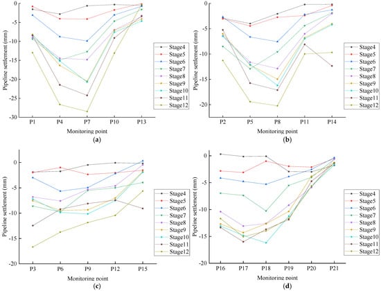 Settlement monitoring points P16-P21 are arranged on the north-side power pipeline (1.2 m × 1.1 m); monitoring points P3, P6, P9, P12, and P15 are arranged on the west-side rainwater pipeline (1.8 m × 1.8 m); monitoring points P2, P5, P8, P11, and P14 are arranged on the west-side sewage rectangular ditch (1.8 m × 1.8 m); and monitoring points P1, P4, P7, P10, P13 are arranged on the west-side sewage pipeline (diameter = 0.4 m) to monitor pipeline settlement during foundation pit excavation. The horizontal distance between the north-side power pipeline and the foundation pit is 13.2 m, while the horizontal distances from the west-side rainwater pipeline, sewage rectangular ditch, and sewage pipeline to the foundation pit are 3.2 m, 5.5 m, and 7.3 m, respectively. The distribution of pipeline settlement along the direction parallel to the diaphragm wall under different working conditions is shown in Figure 15. Field analysis revealed that settlement of the west-side stormwater pipeline, wastewater box culvert, and wastewater pipeline increased continuously throughout the excavation process. Settlement of the north-side power pipeline was primarily concentrated in the early stages (Stages 4–8) and was significantly lower overall than that of the west-side pipelines. This difference is attributed to the real-time dynamic axial force compensation provided by the north-side servo steel struts, which effectively suppressed soil displacement outside the pit, thereby reducing pipeline settlement. Regarding settlement distribution morphology, the settlement curves of pipelines parallel to the diaphragm wall exhibited a typical “concave” settlement profile, characterized by smaller settlement near pit corners and larger settlement at the pit center. This reflects the influence of the corner effect. The pit corner regions, constrained by their three-dimensional stress state, exhibit lower soil displacement sensitivity than the two-dimensional stress state prevalent in the pit center [].