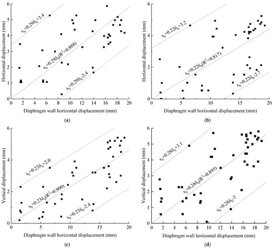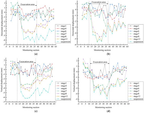 Displacement relationship between the metro tunnels and diaphragm walls: (a) horizontal displacement of line 11 up track; (b) horizontal displacement of line 9 up track; (c) vertical displacement of line 11 up track; (d) vertical displacement of line 9 up track.