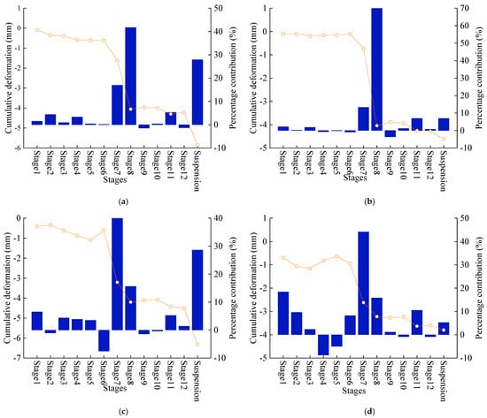 Proportion of displacement of metro tunnels in each construction stage: (a) horizontal displacement of line 11 up track; (b) horizontal displacement of line 9 up track; (c) vertical displacement of line 11 up track; (d) vertical displacement of line 9 up track.