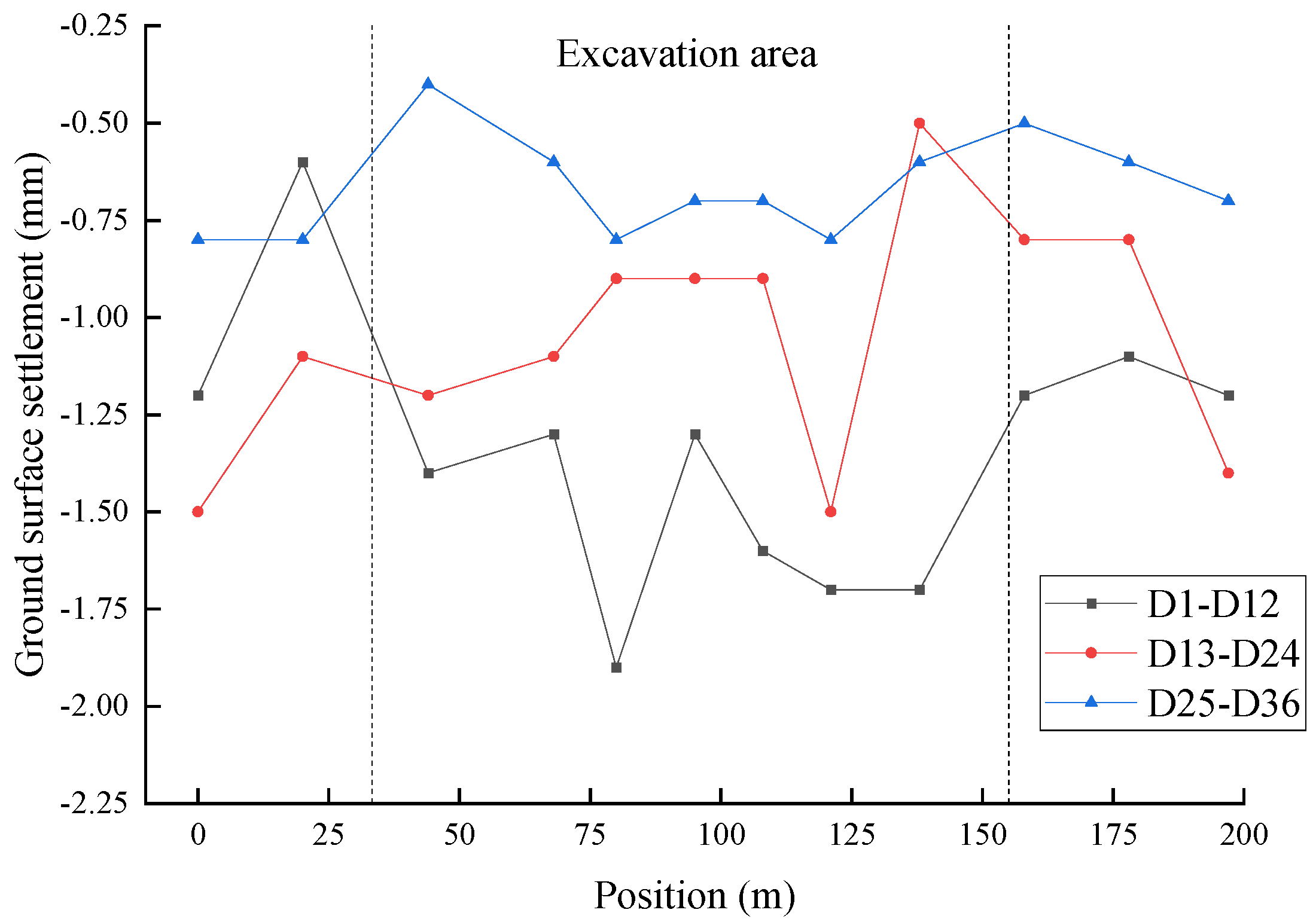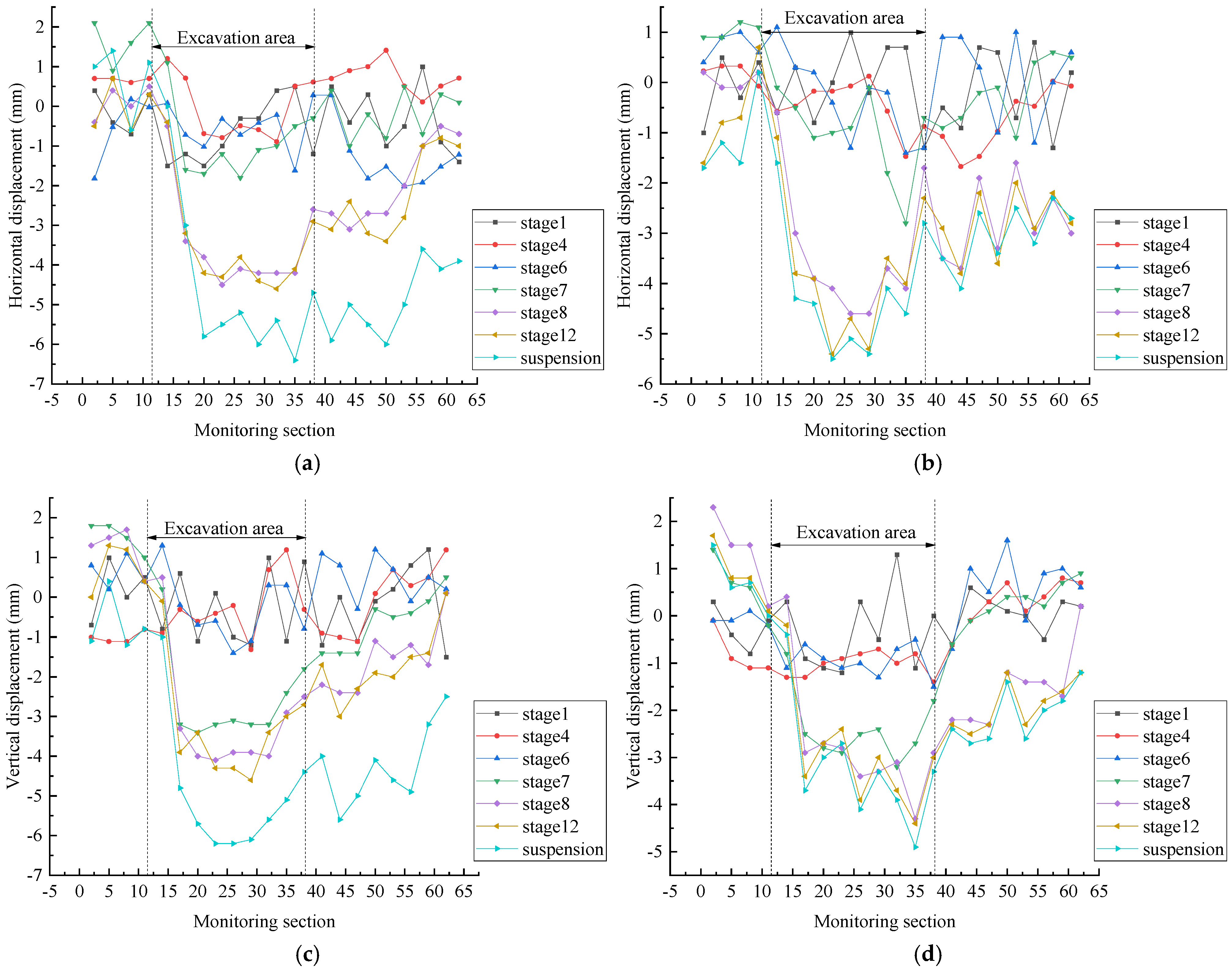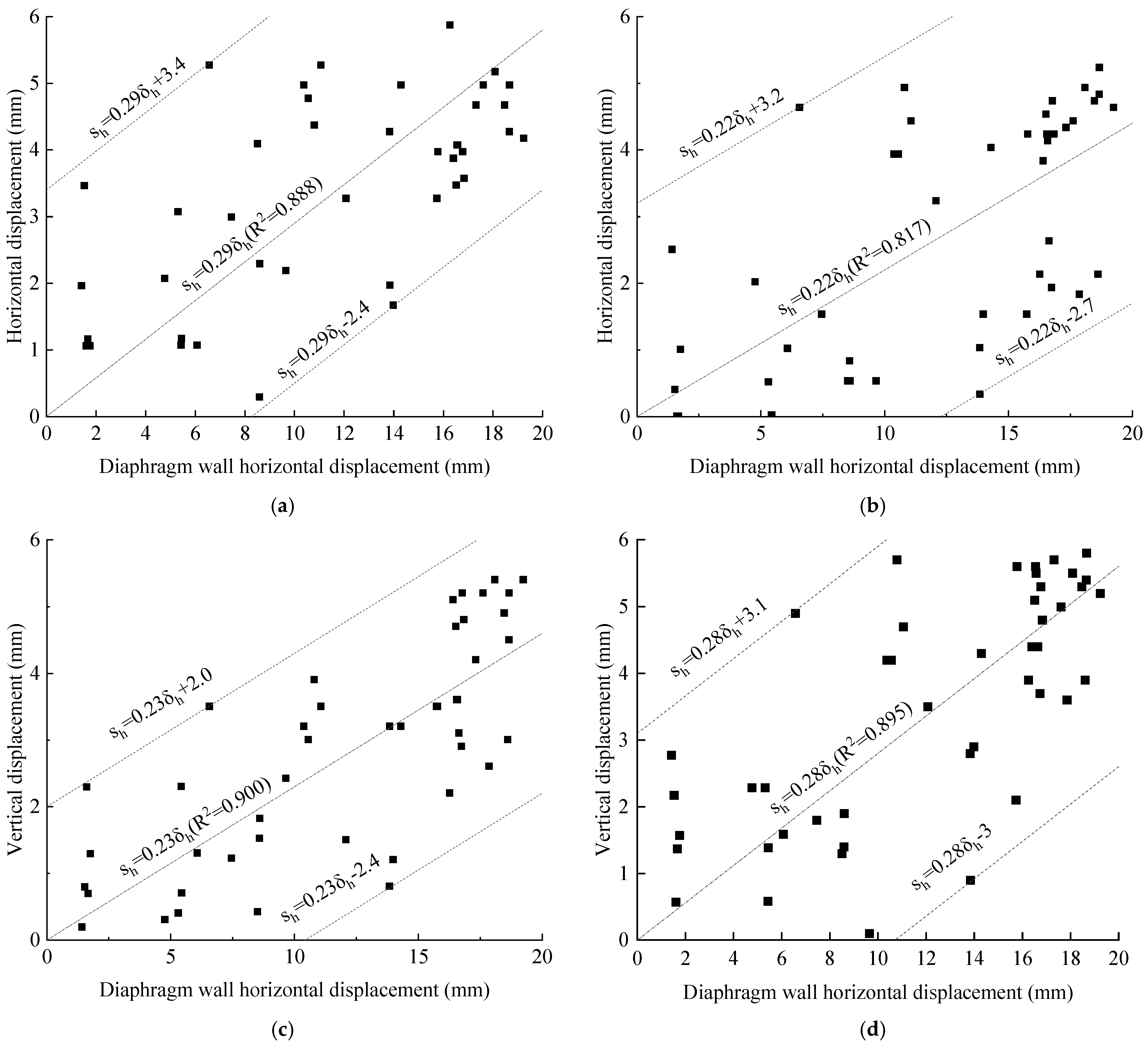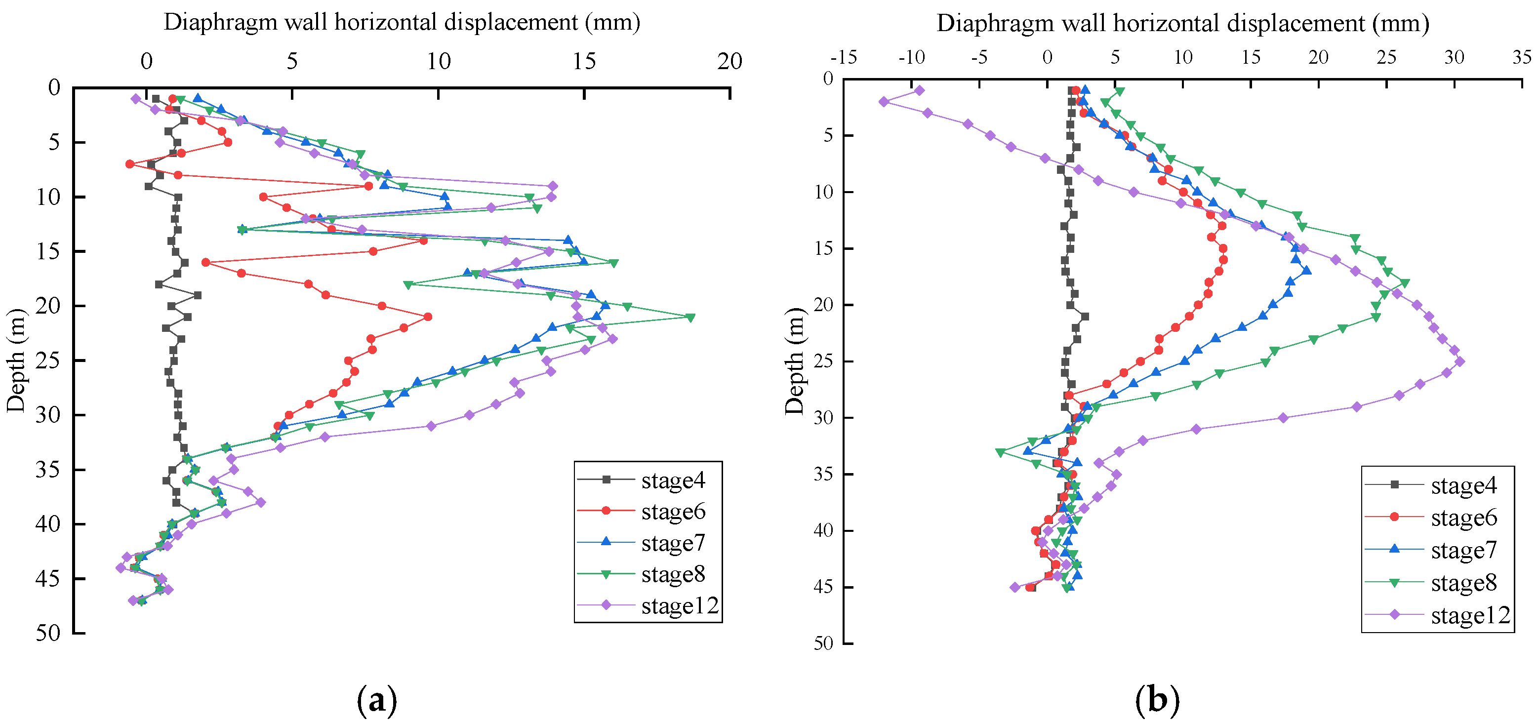 4.2. Displacement Relationship Between the Metro Tunnel and Diaphragm Wall