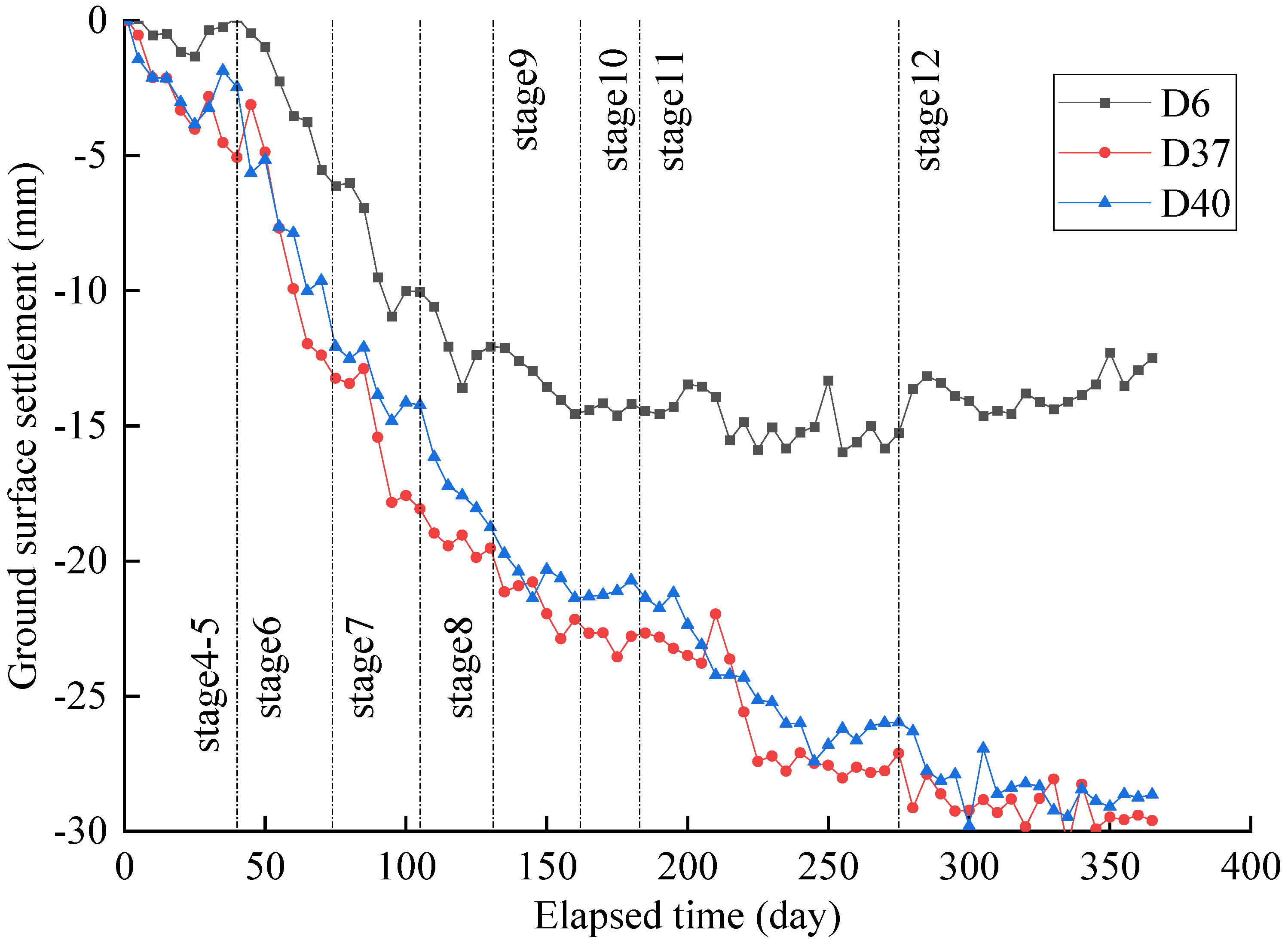 - The significant rheological properties of artificial fill and soft soil in reclaimed areas result in notable time-dependent effects on foundation pit deformation. During the construction suspension period, metro tunnel deformation accounted for up to 29% of the total displacement, with tunnels closer to the foundation pit exhibiting more pronounced time-dependent effects. Therefore, timely support after excavation is crucial to reduce unsupported exposure time. Following excavation completion, the base slab should be poured and the substructure constructed in a timely manner to mitigate the amplification of time-dependent effects caused by prolonged construction activities. The corner effect of the foundation pit is significant, with surface settlement, pipeline settlement, and metro tunnel deformation near the corner being substantially smaller than those near the mid-span section. Beyond 10 m from the corner, tunnel deformation characteristics gradually approach a plane strain state.