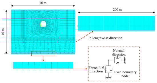 To validate the effectiveness of the proposed method, a finite element model was initially developed for verification. A three-dimensional model for simulating the interaction between the tunnel structure and the surrounding stratum was constructed by using the ANSYS (v2024 R2). The model measures 40 m in height, 60 m in width, and 200 m in length. The geometry was modeled using Boolean operations: a volumetric block that represented the stratum was first created, after which a tunnel cross-section was introduced 10 m above the base and subtracted to form the tunnel void. The lining was modeled as a continuous structure with a uniform thickness of 0.5 m, and the track bed was assigned a thickness of 0.4 m. The stratum and lining were discretized by using SOLID185 elements. The constitutive behavior of the surrounding rock was described by a simplified strain-softening Mohr–Coulomb model to balance accuracy and computational efficiency. The boundary conditions were defined as follows: The bottom surface was fully fixed; the four lateral surfaces were constrained in the normal direction; and the top surface was left free. The model accounted for self-weight to simulate long-term deformation of the tunnel structure. The finite element model is depicted in Figure 6.