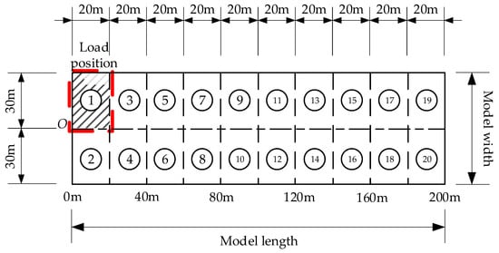 Following the application of loads to the model for numerical analysis, the relative convergence deformation at both sidewalls of the tunnel structure was extracted as the output variable, with a spatial sampling interval of 20 m. To verify the reliability of inverting cross-sectional convergence using tilt sensors, both the tilt angles at convergence measurement points and the actual convergence deformation at the neutral axis were obtained. The comparative results indicated only minor discrepancies between the two datasets. The longitudinal strain values on both sides of the lining at the convergence monitoring sections were extracted as input variables, with a high spatial resolution of 0.2 m. For each convergence cross-section, strain data from 10 adjacent sections (both upstream and downstream) were incorporated. To simulate the inhomogeneous geological conditions that are typical of mountain tunnels, a uniform load of 30 t/m2 was applied to various regions on the top surface of the model. This approach replicated static structural deformations under 20 distinct surrounding rock scenarios, in addition to the inherent self-weight loading. The applied loading configurations are presented in Figure 7. Strain and convergence data points from a total of 180 cross-sections were compiled for analysis. The dataset was randomly partitioned, with 80% assigned for training and the remaining 20% reserved for testing.