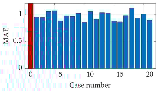 By leveraging the trained model and incorporating strain data from adjacent cross-sections, convergence at the central monitoring section was predicted. The convergence predictions under loading cases 0 (weight only), 1, and 9 are illustrated in Figure 9, and the corresponding errors across all load cases are summarized in Figure 10. The results indicate strong agreement between the predicted and measured convergence values, with all mean absolute errors remaining below 1.2 mm. In addition, it can be observed that loading case 0 (with red bar) exhibits the largest error, which indicates that the prediction results become more accurate as the load increases with larger structural deformation and strain. These findings confirm the model’s high accuracy in predicting deformation under varied loading scenarios and validate the reliability of the proposed method for monitoring tunnel convergence. The consistently low prediction errors further support the practical utility of this approach in structural health assessment for heavy-haul railway tunnels.