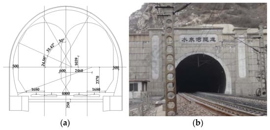 Shuiquanwan Tunnel: (a) cross-section of the tunnel (unit: mm); (b) tunnel entrance.