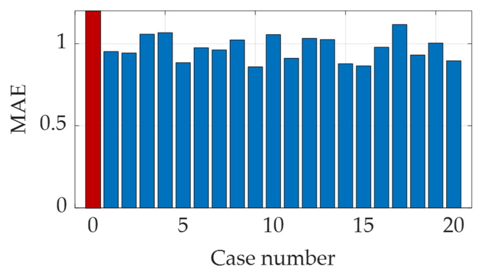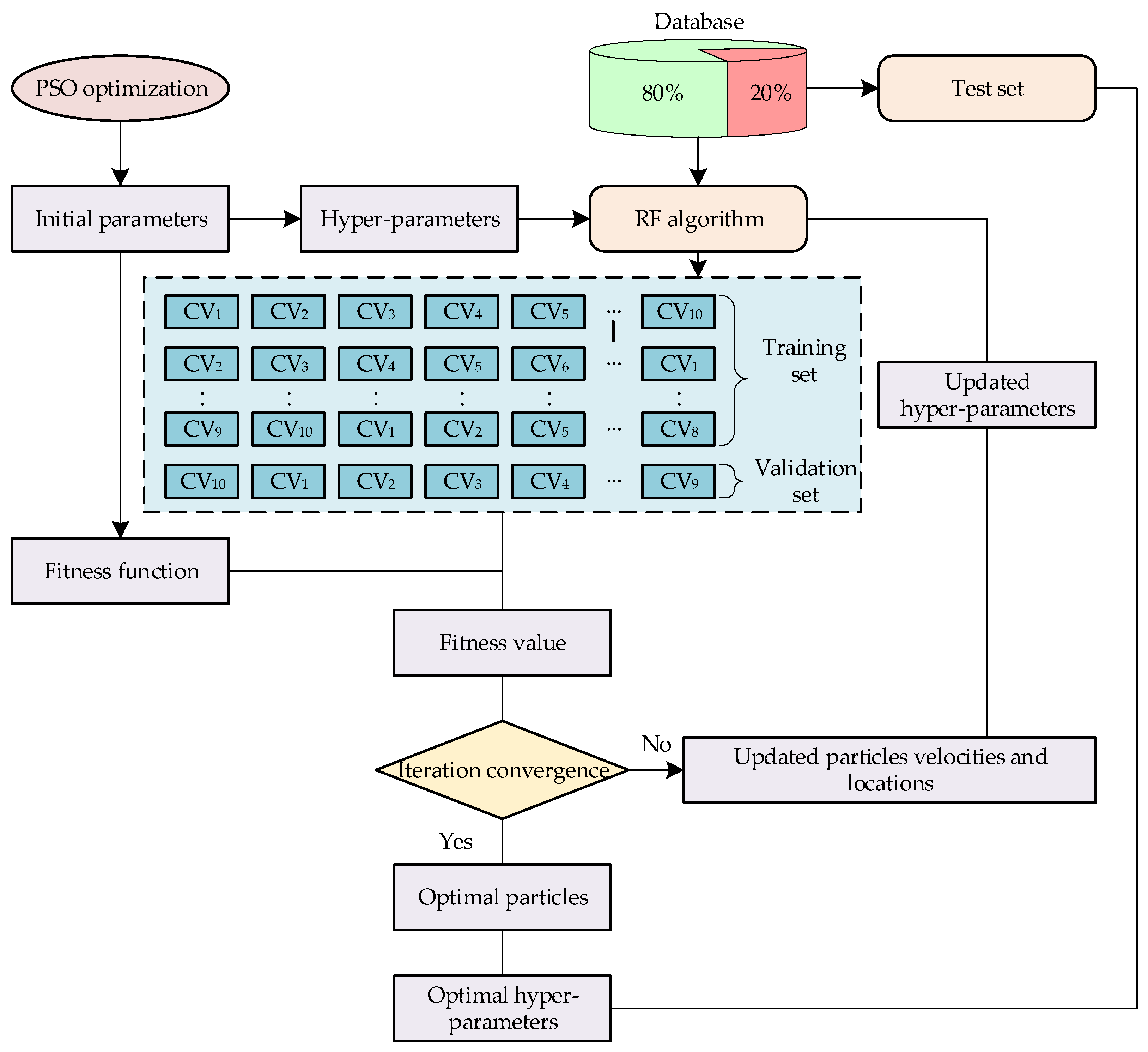 - The PSO fitness function is defined as the average mean absolute error (MAE) that is obtained via k-fold cross-validation. Given its prevalent adoption in machine learning [34], a 10-fold CV strategy is employed. The dataset is randomly partitioned into 10 subsets, with 9 subsets used for training and the remaining subset for validation. This process is repeated 10 times, such that each subset serves as the validation set once. The MAE is computed for each validation fold, and the average MAE across all folds is used as the PSO fitness value. The fitness function is formulated as follows:where represents the mean absolute error for the i-th validation set. The particle velocity and position are updated on the basis of the fitness values to generate the next generation of particles, and the PSO algorithm proceeds to the next iteration.