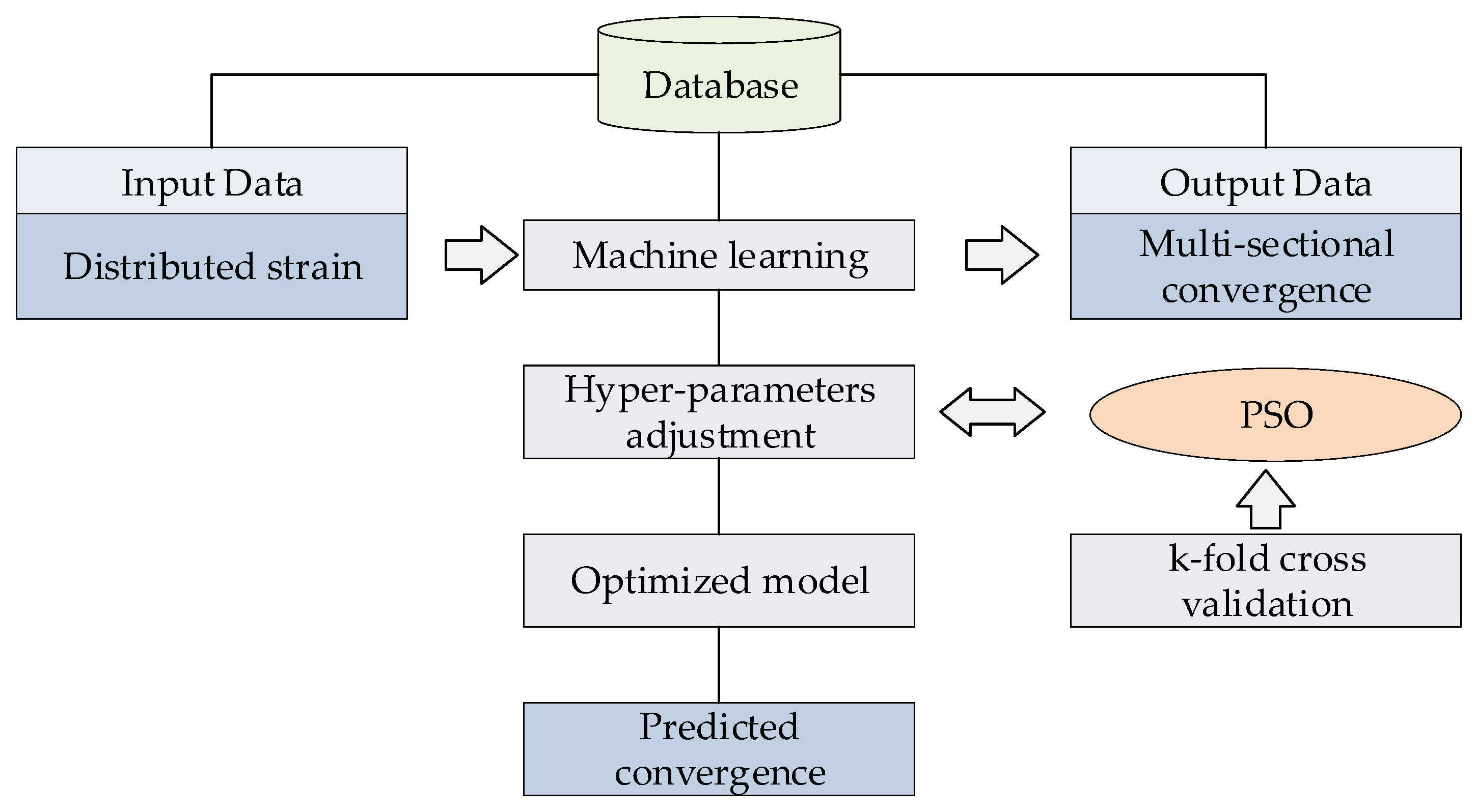 - Model Training Phase: By using an existing database (constructed from numerical simulations or historical monitoring data), a convergence prediction model for heavy-haul railway tunnels is developed. The hyperparameters of the machine learning algorithm are optimized via a PSO hybrid algorithm to improve the prediction accuracy.