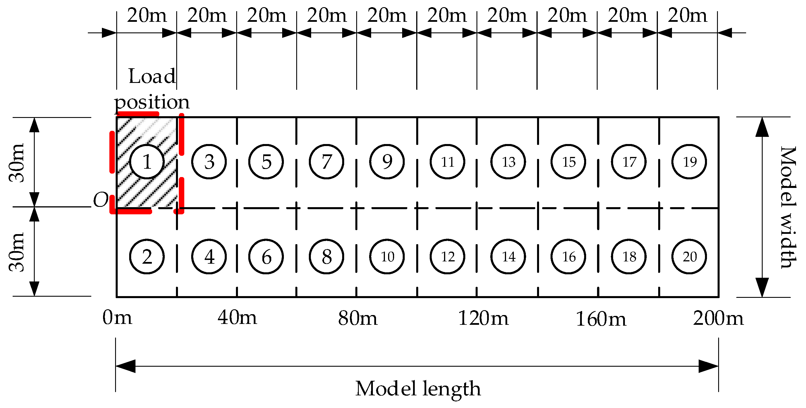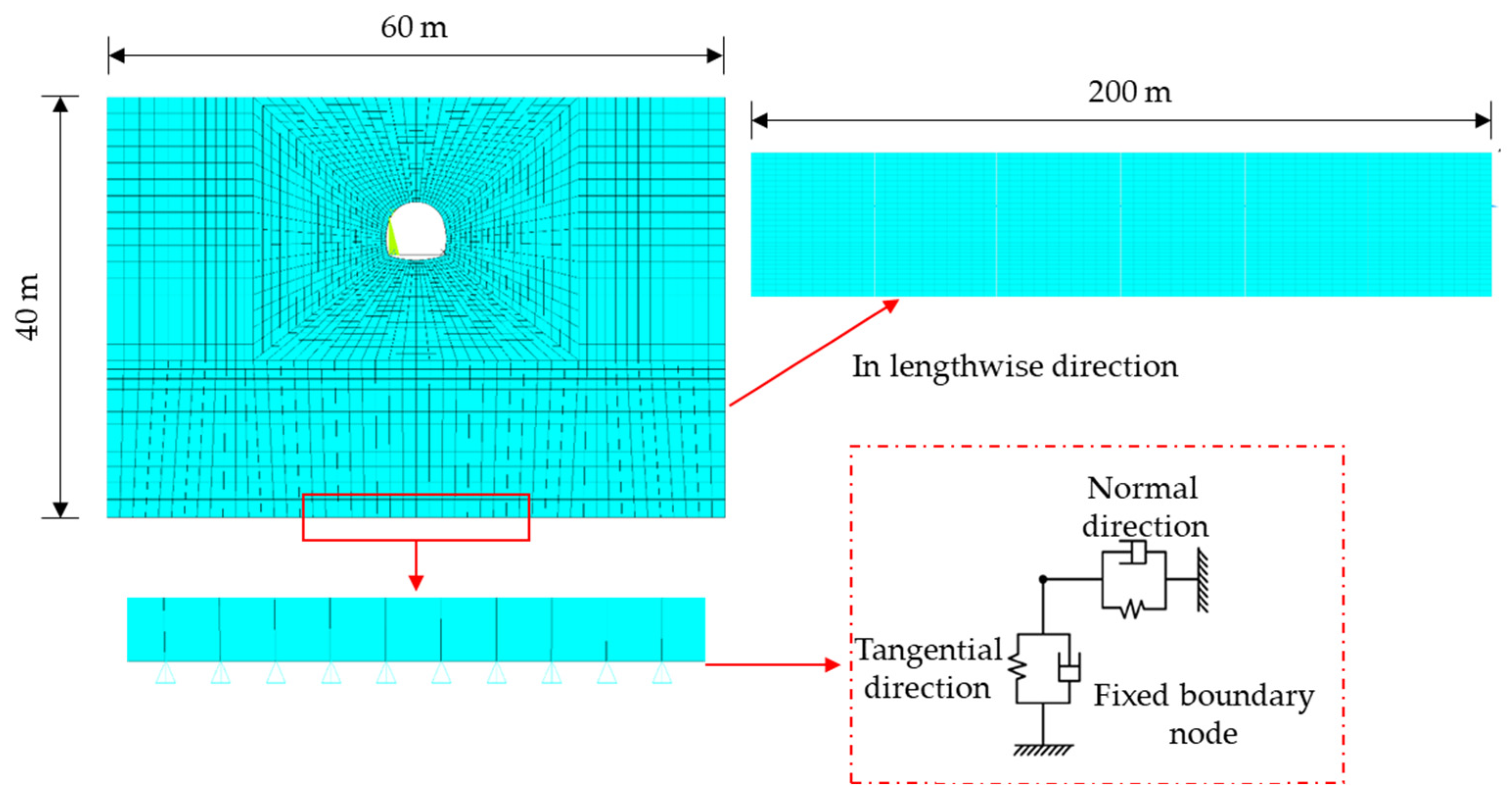 | Material | Modulus of Elasticity (GPa) | Poisson’s Ratio | Weight (kN·m−3) | Cohesive Strength (MPa) | Internal Friction Angle (°) |