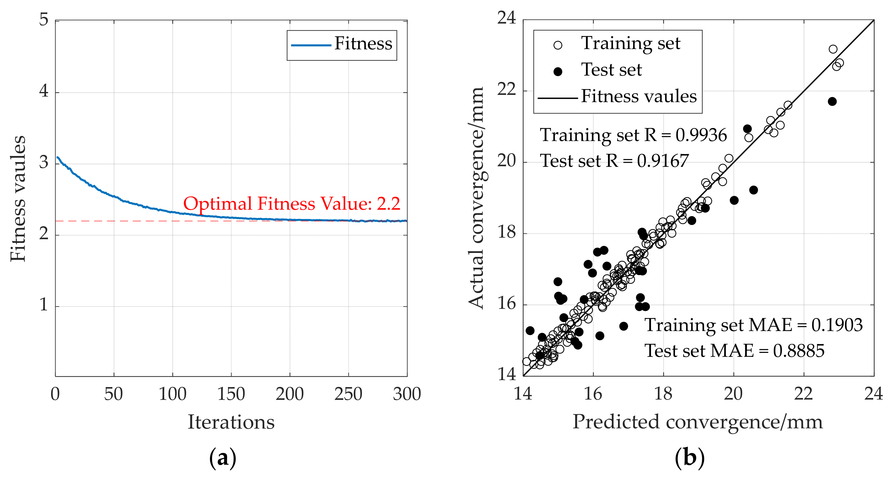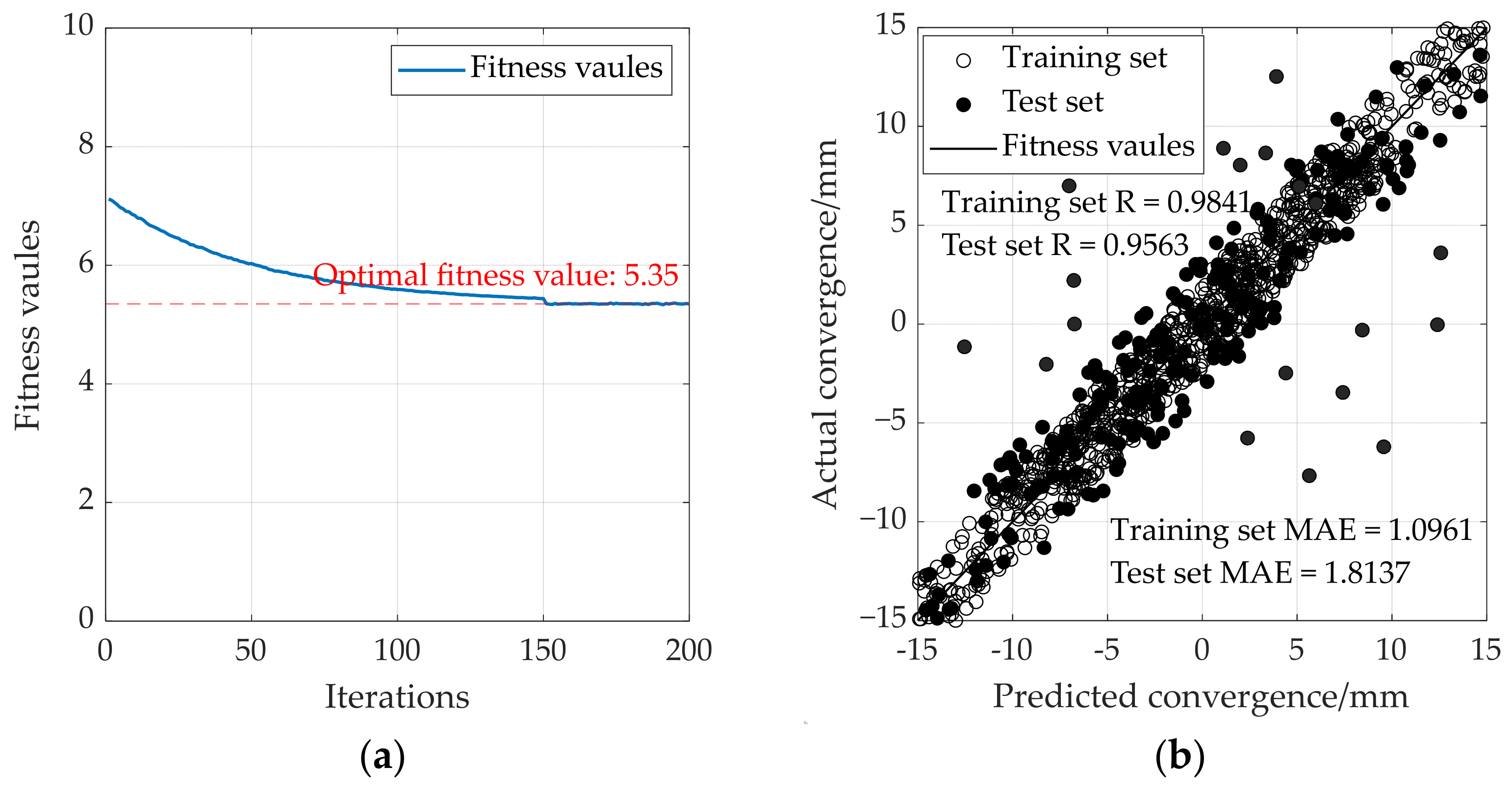 - The PSO algorithm is configured with a predefined maximum number of iterations. In each iteration, the fitness value of every particle is evaluated. The iterative procedure terminates when either the fitness value satisfies the target performance criterion or the maximum iteration count is attained. Upon meeting the stopping condition, the optimization process concludes and yields the globally optimal particle position, which corresponds to the optimal set of hyperparameters for the machine learning algorithm.To increase computational efficiency and minimize the influence of variations in parameter scales on model performance, the data are normalized to the interval [−1, 1]. The resulting predictions are then inversely transformed back to the original parameter space. The normalization procedure is defined by Equation (12):To assess the performance of the random forest (RF) algorithm in reconstructing cross-sectional convergence deformation from distributed optical fiber strain data, two evaluation metrics are adopted: the mean absolute error (MAE) and the Pearson correlation coefficient (R).where represents the measured value of cross-section convergence; represents the predicted value of cross-section convergence; represents the average of the measured cross-section convergence values; and represents the average of the predicted cross-section convergence values. Here, the smaller the value of is, the larger the value of , which indicates better predictive performance of the algorithm model.