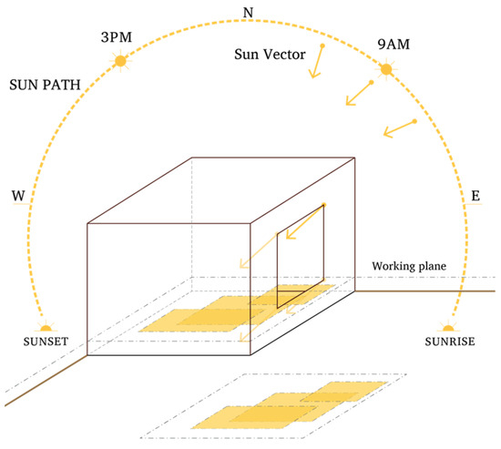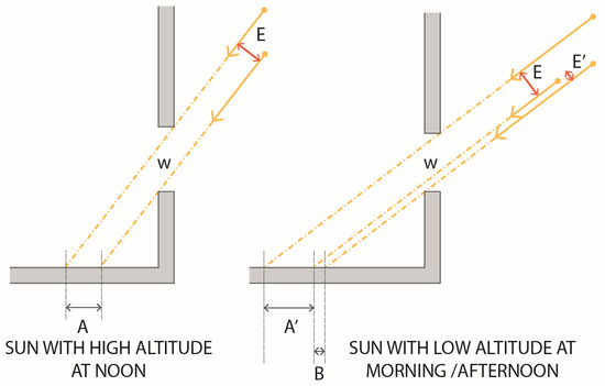 This geometric relationship clarifies why, even with an identical window size , the amount of transmitted energy () and the sunlight area () on the plan surface vary significantly throughout the day. At low solar altitudes, the window can deliver an additional energy component () into the room, increasing the sunlight area from A to () (Figure 1).