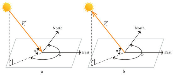 A reverse sunlight vector (Figure 5b) originates from the receiver point and is oriented based on the sun’s position at a specific time, defined by the solar altitude angle and azimuth angle . The vector direction can be expressed as: