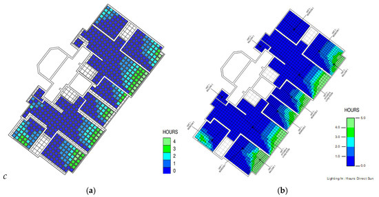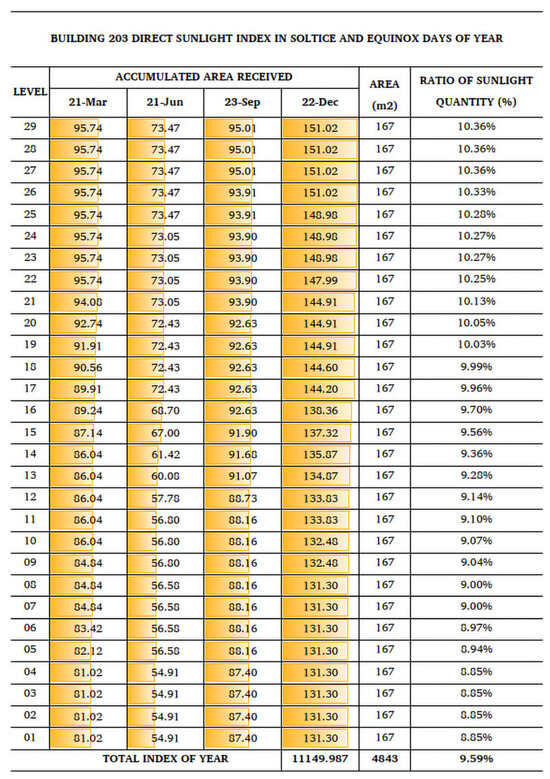 Moreover, there is an increase in direct sunlight area from the lower to upper level. This pattern results from the shadow effects of surrounding buildings on the lower floors. Although in each season, the differences in direct sunlight area between levels are small (Figure 12), but in a year, the gaps are notable (Table 6). This index provides residents with a quick way to identify which units receive the most and least direct sunlight annually. Architects can use these results to refine façade design, window configuration, or orientation strategies to optimize daylight access for multiple units.