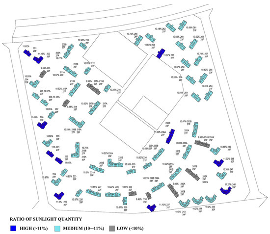 The direct sunlight ratio of Buildings in the Jamsil Ricenz Apartment Complex.