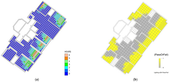 Level 5, building 203: (a) Visual output plan in one year of direct sunlight by reverse sunlight vector method; (b) visual output plan in one year of sDA & ASE method by Insight.