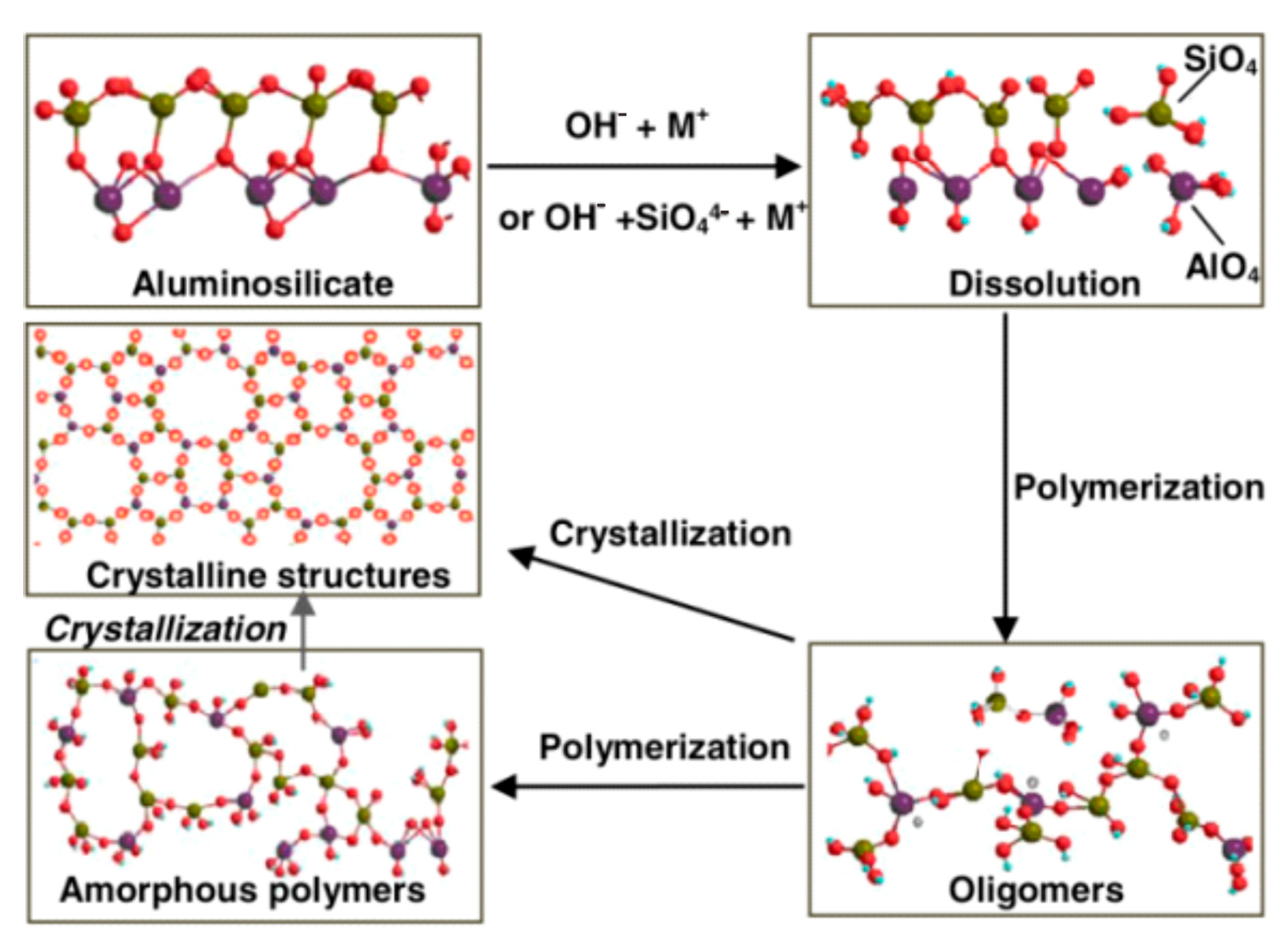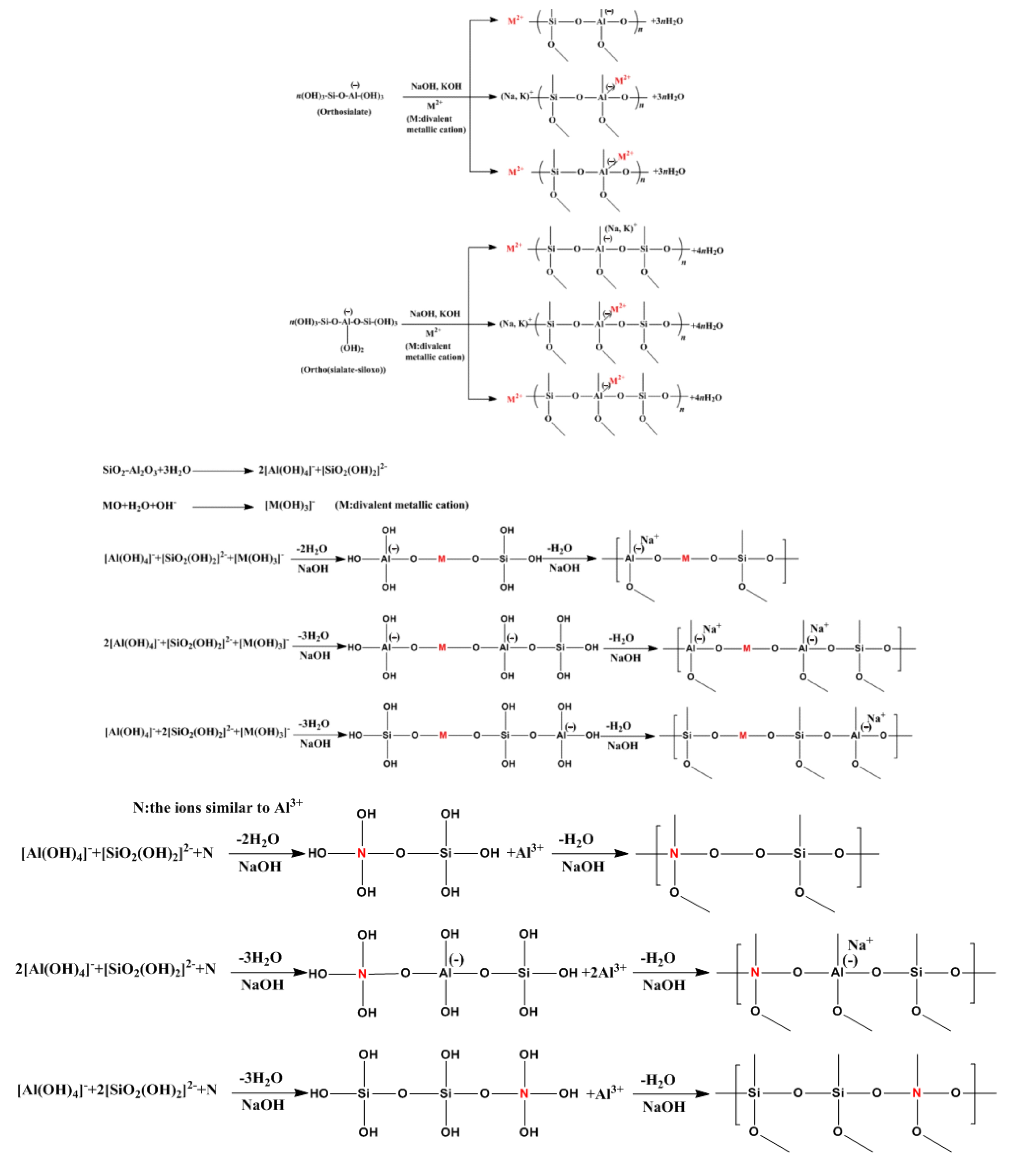 - Van Deventer, J.; Provis, J.; Duxson, P.; Lukey, G. Reaction mechanisms in the geopolymeric conversion of inorganic waste to useful products. J. Hazard. Mater. 2007, 139, 506–513. [Google Scholar] [CrossRef]