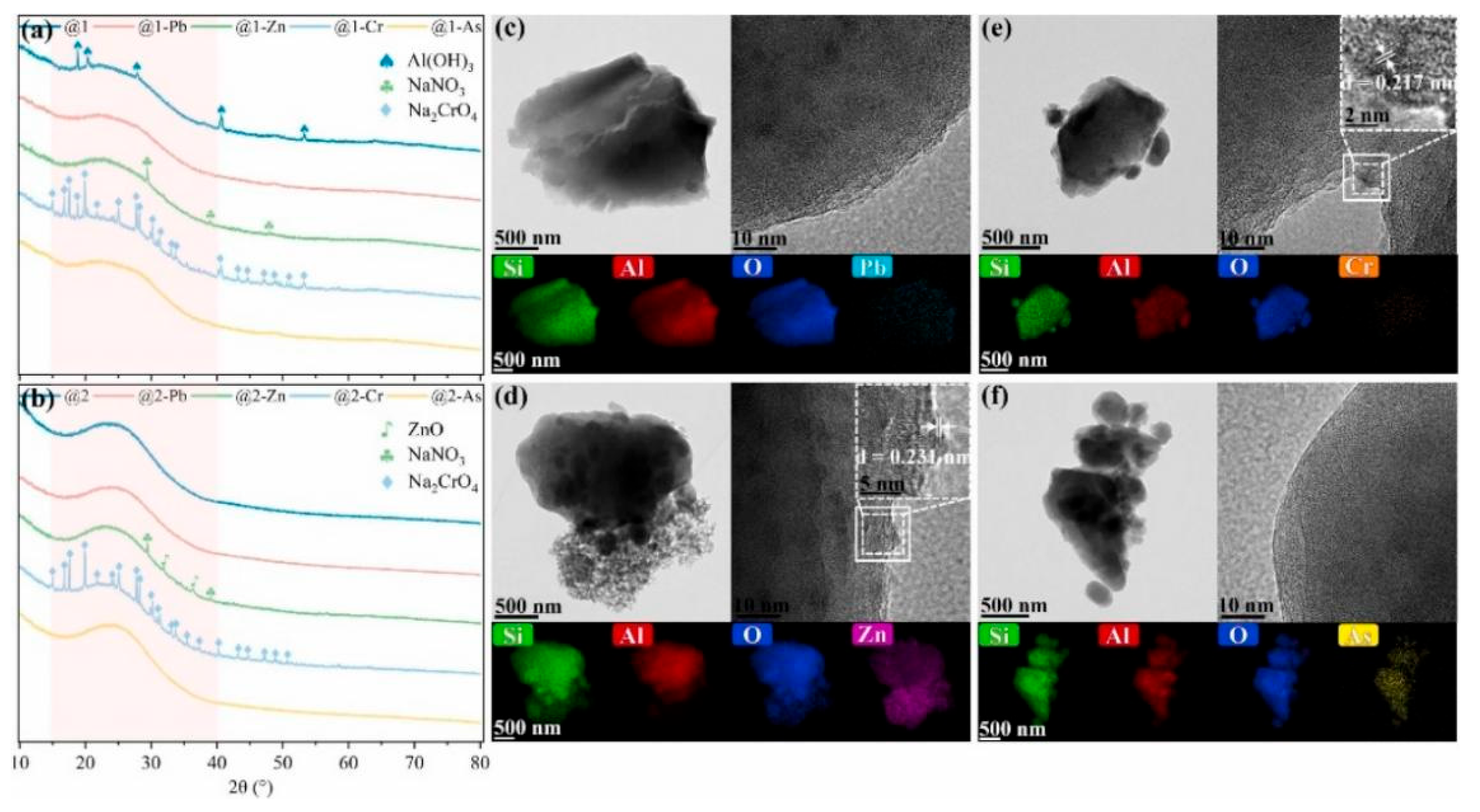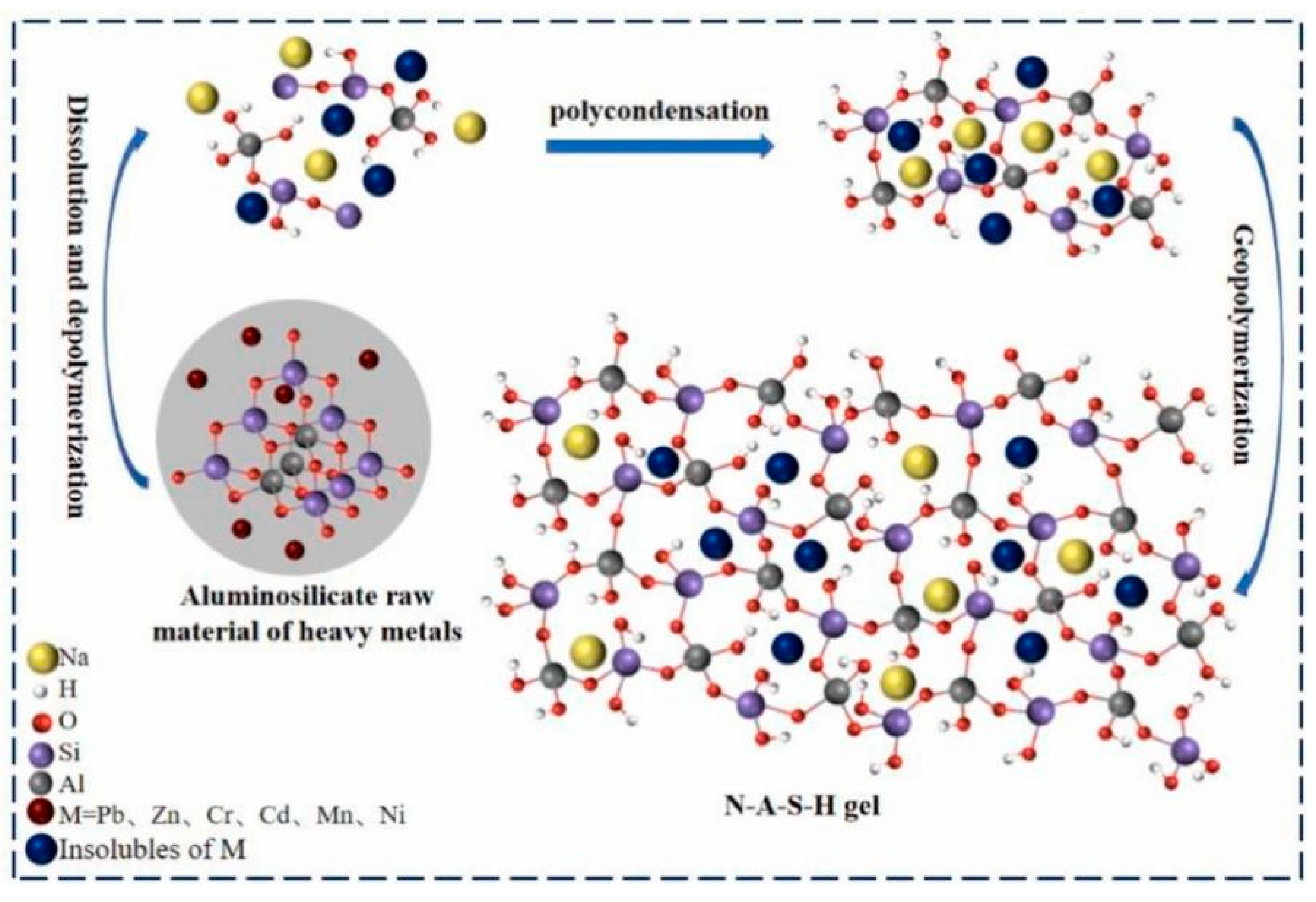- Wang, P.; Wei, X.; Chen, H.; Xie, F.; Shen, X.; Zheng, P.; Yan, F.; Bai, W.; Zhang, Z. Microstructural Evolution and Immobilization Mechanisms of Geopolymers Incorporating Cationic and Oxyanionic Heavy Metals (Pb2+, Zn2+, Cr2O72−, and AsO2−). J. Environ. Chem. Eng. 2025, 13, 117784. [Google Scholar] [CrossRef]