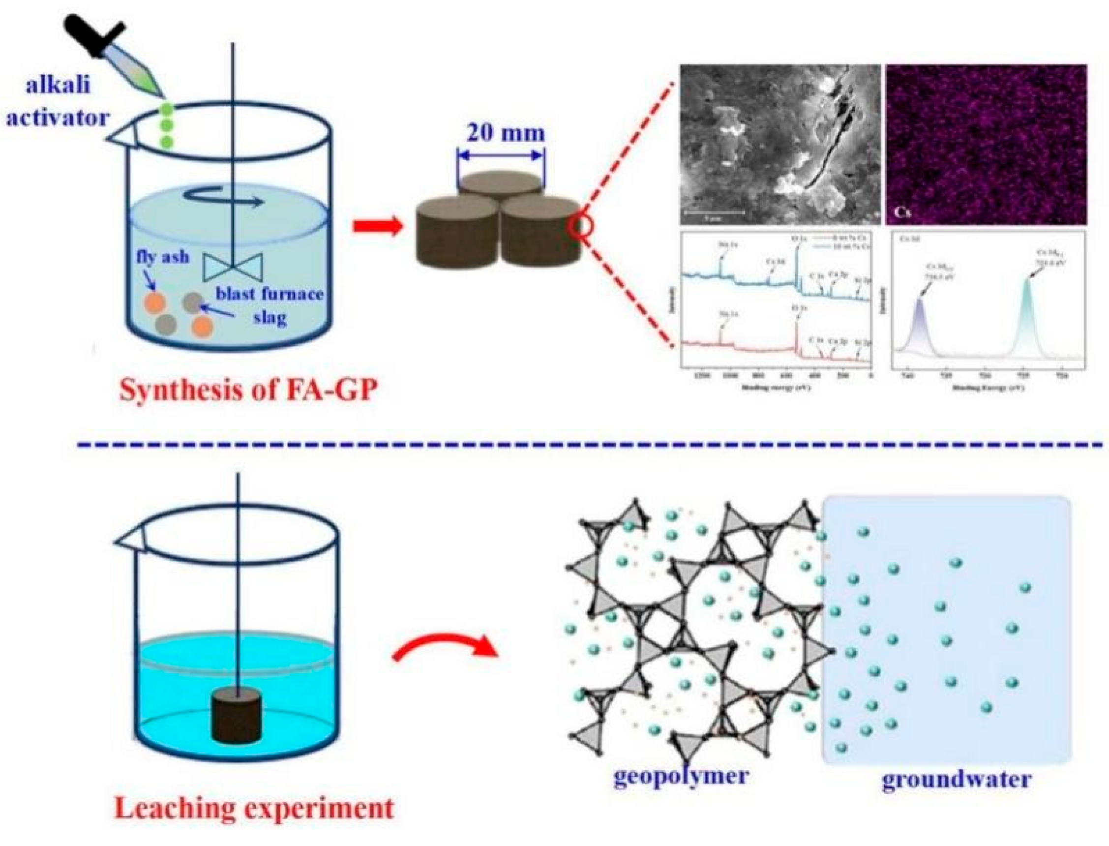 - Tian, Q.; Wang, H.; Pan, Y.; Bai, Y.; Chen, C.; Yao, S.; Guo, B.; Zhang, H. Immobilization Mechanism of Cesium in Geopolymer: Effects of Alkaline Activators and Calcination Temperature. Environ. Res. 2022, 215, 114333. [Google Scholar] [CrossRef]