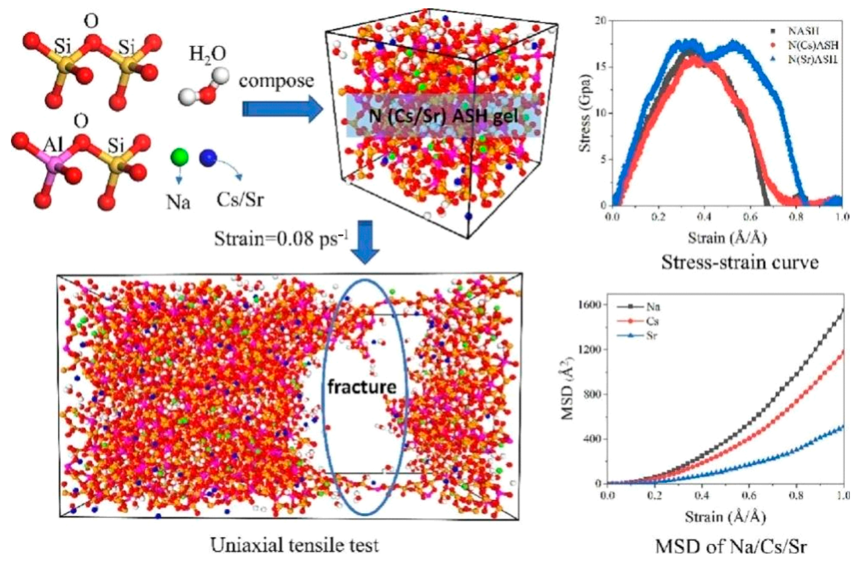 - Wu, D.; Cao, K.; Chen, K.; Mao, N. Interfacial Characteristics and Mechanical Behavior of Geopolymer Stabilizers with Clay Mineral: A Molecular Dynamics Study. Appl. Clay Sci. 2024, 250, 107286. [Google Scholar] [CrossRef]