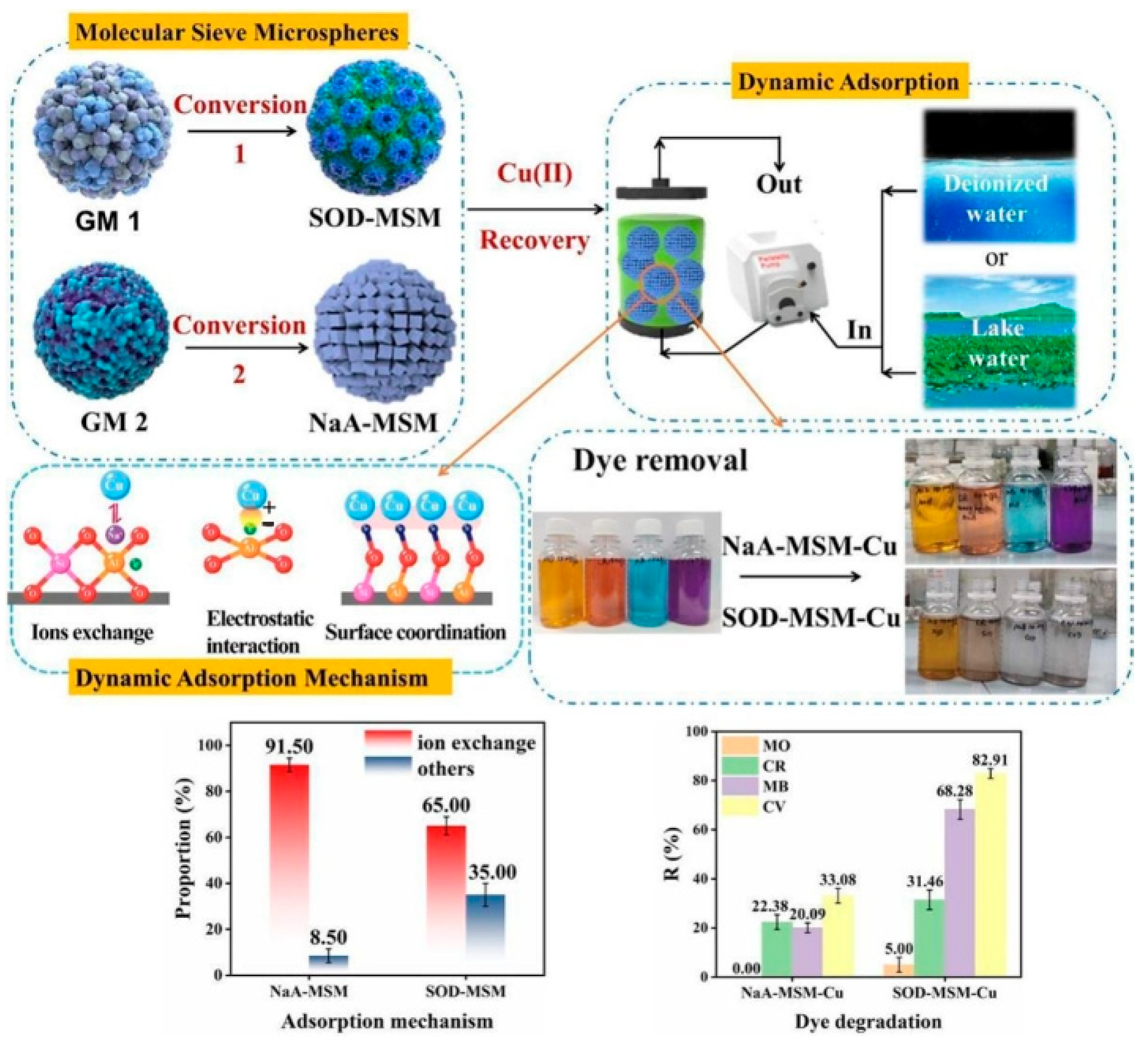 3.3. Adsorption of Organic Dyes
